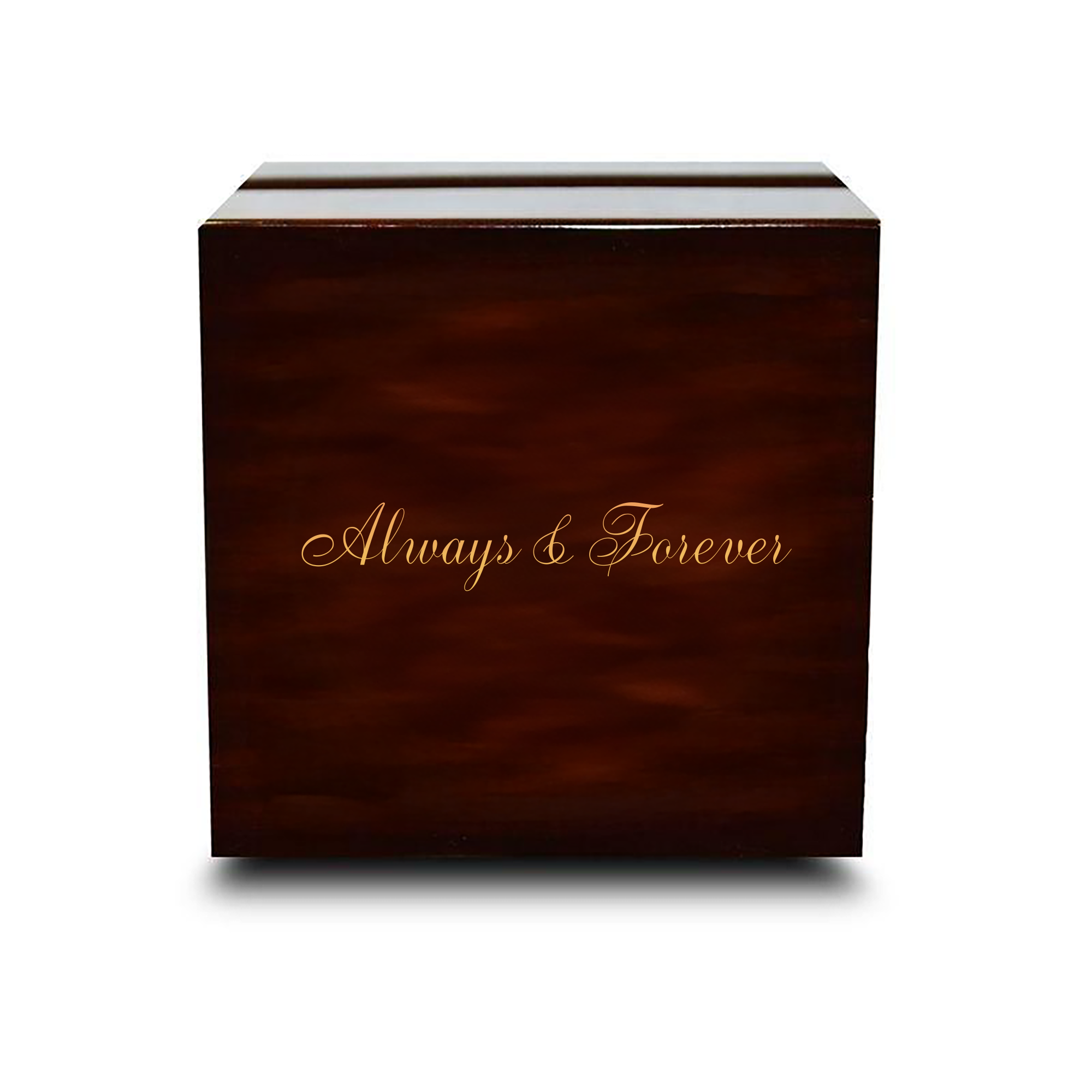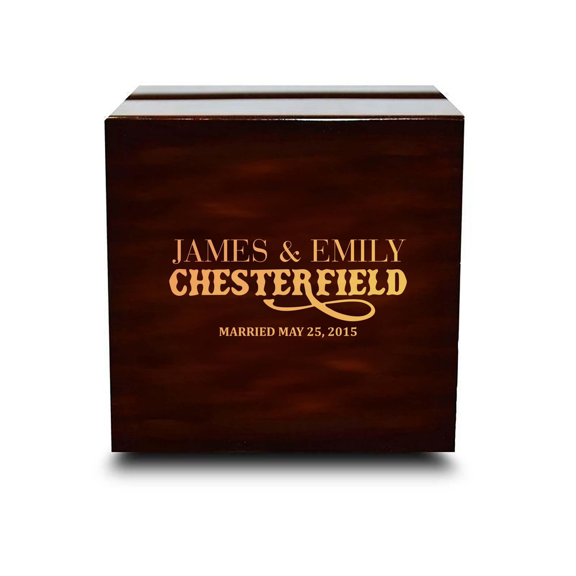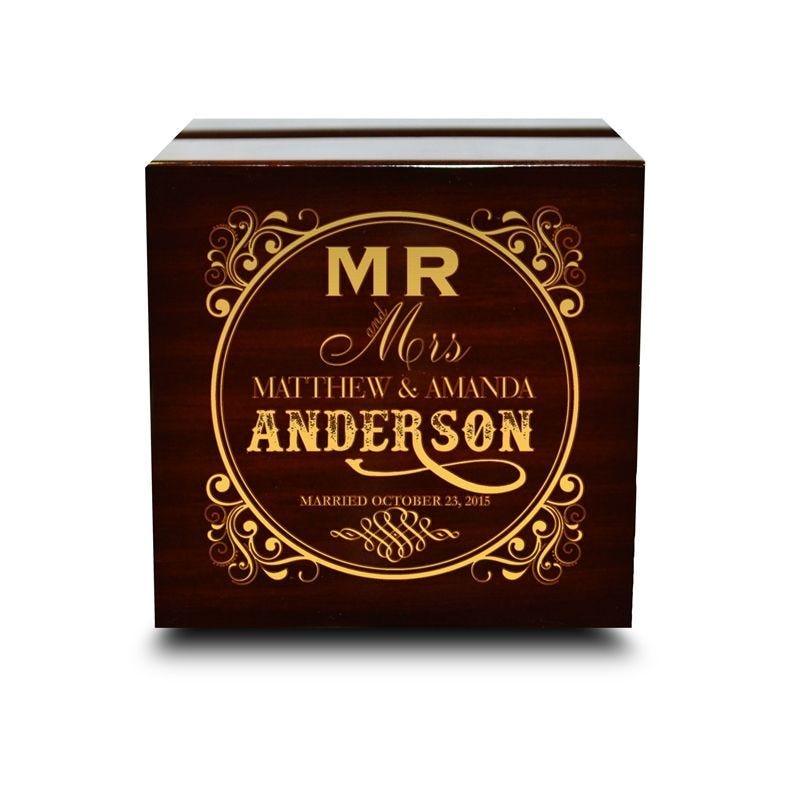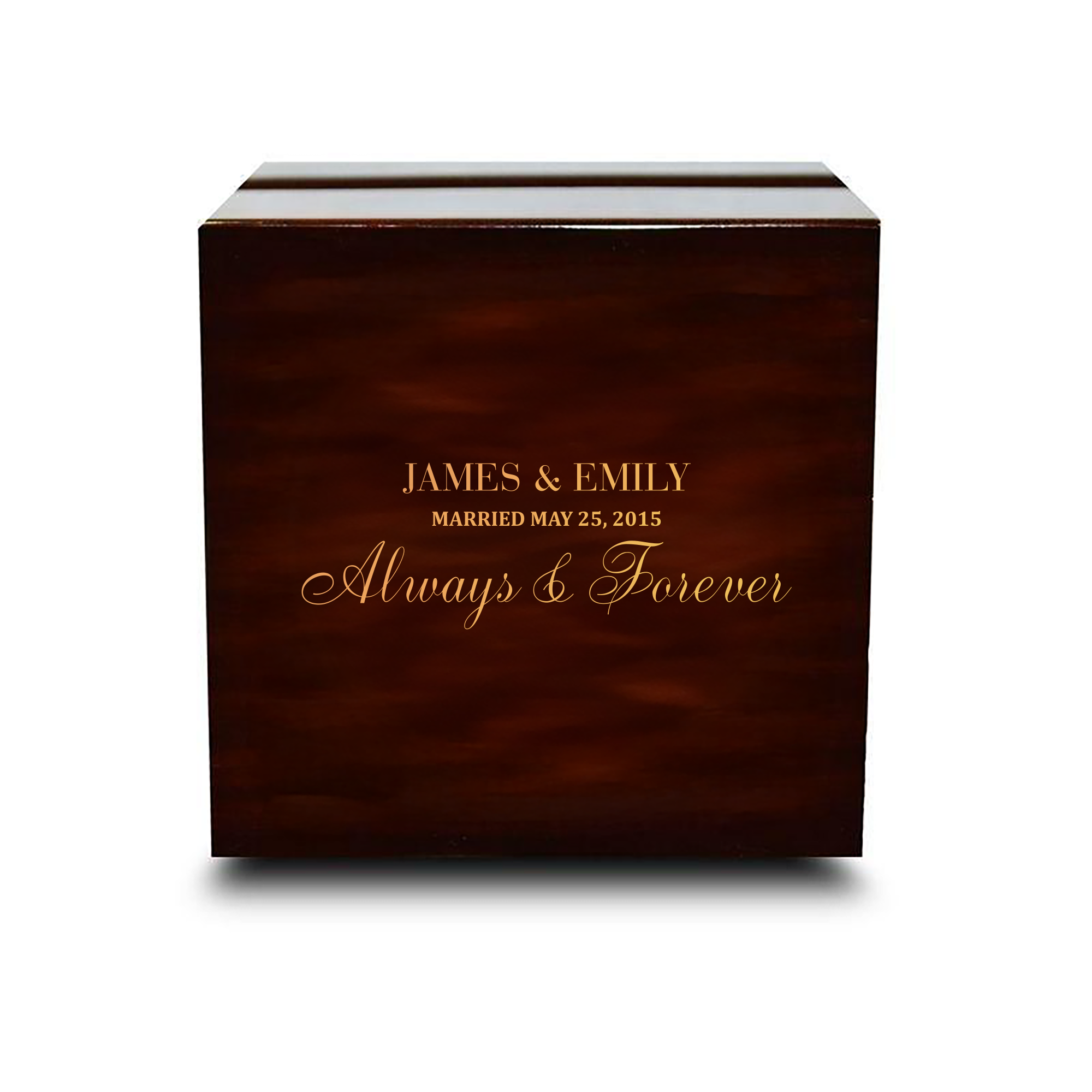 This beautiful light updark brown chocolate wood ring box is the perfect additional to your wedding band. You can now have a beautiful light that turns on every time your ring box is open to show the full beauty of your ring! We offer a wide variety of fonts and symbols to make sure that your personalized engraving is not only beautiful but truly unique. Images, including fingerprints and even engagement pictures, can be engraved on this box. For custom request please call.