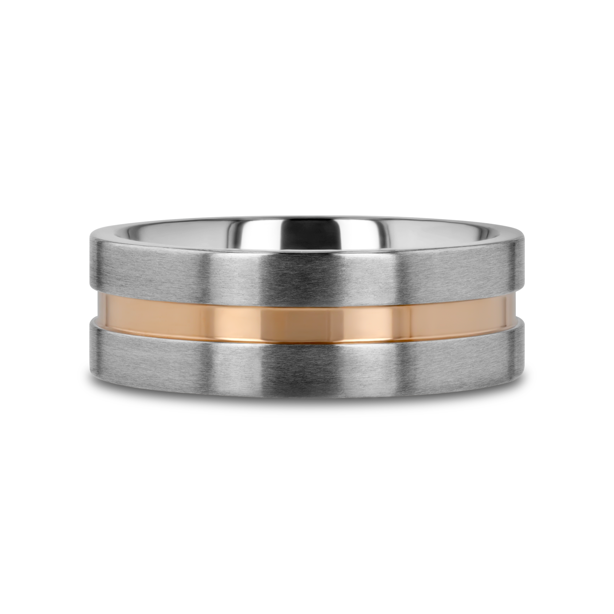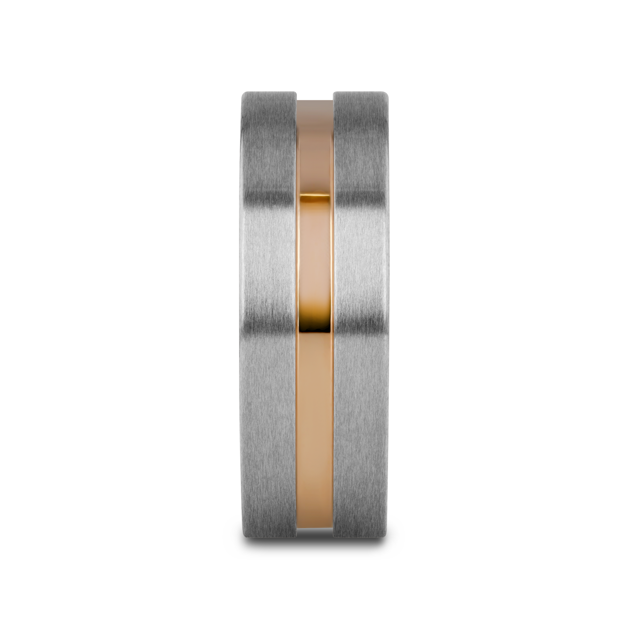MARS Titanium Flat Brushed Finished Men’s Wedding Ring with Rose Gold Plated Groove Center - 8mm