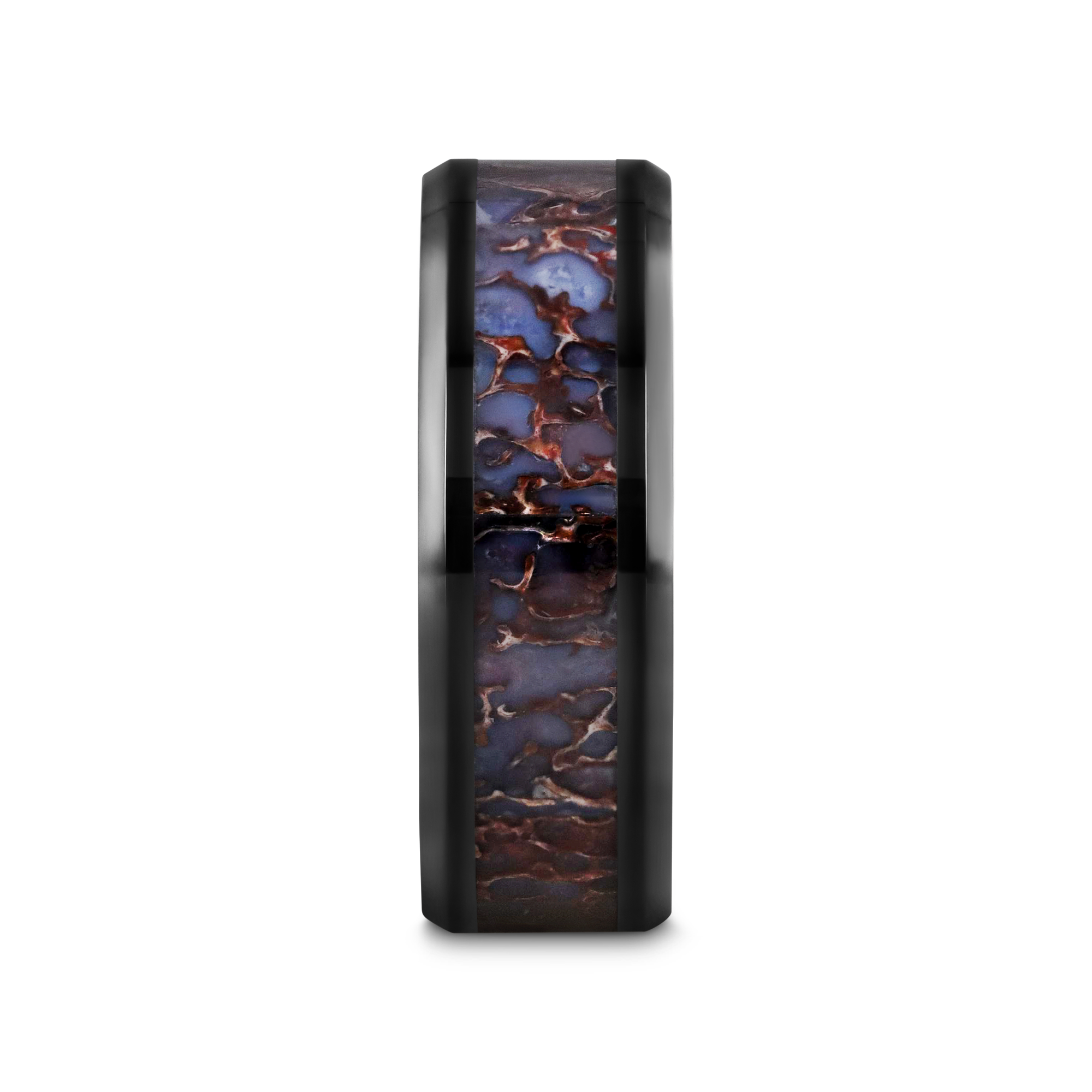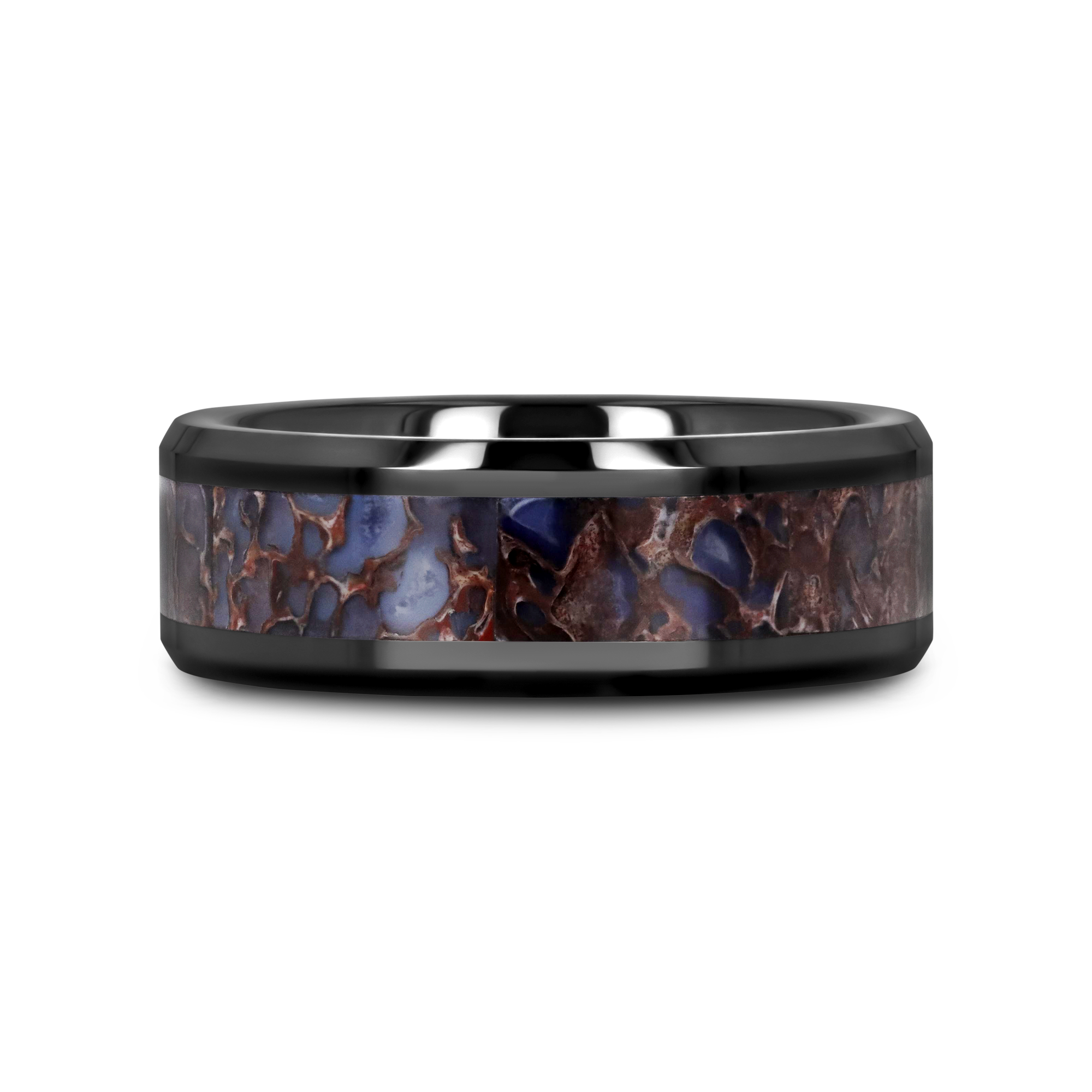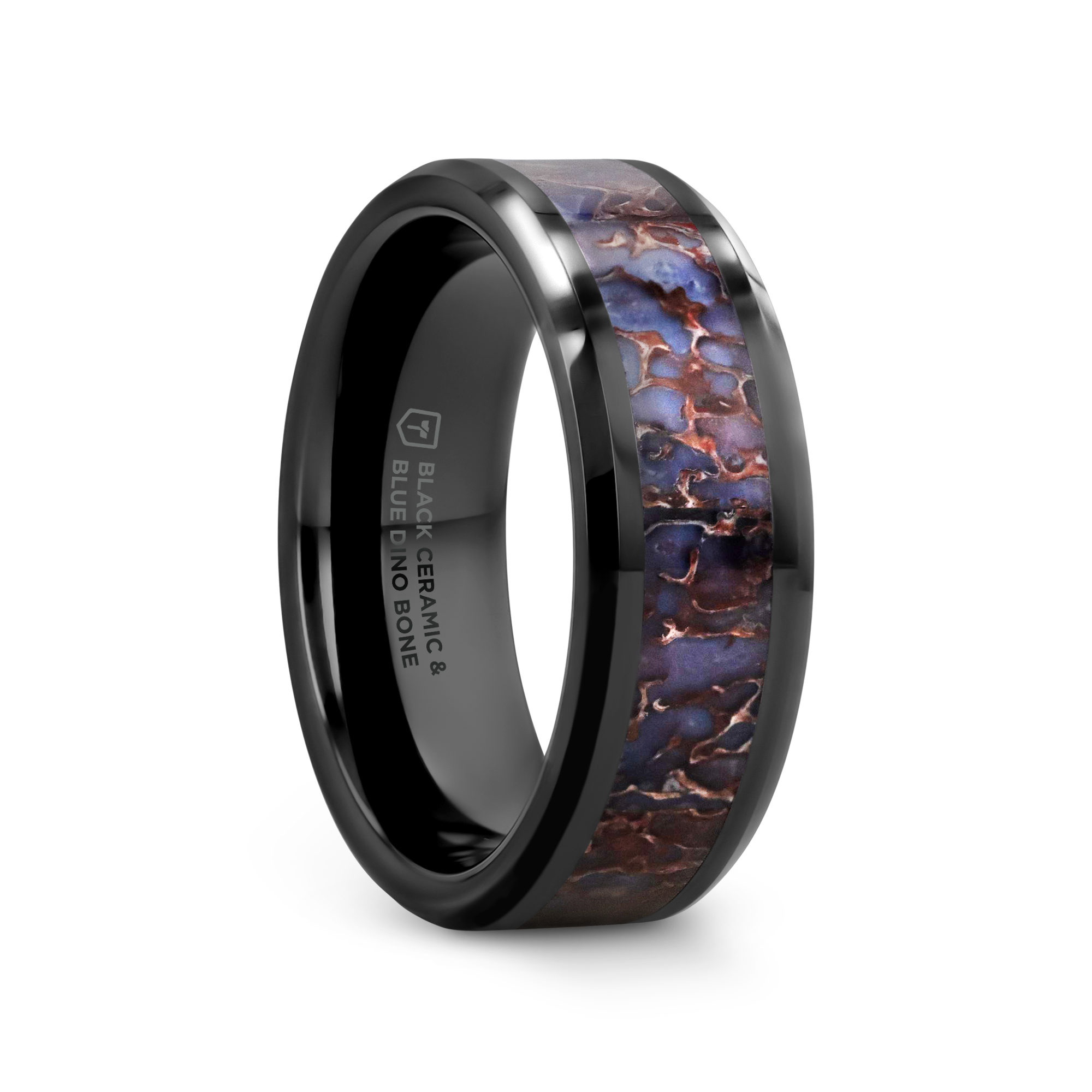 PERMIAN Genuine Blue Dinosaur Bone Inlaid Black Ceramic Beveled Edged Ring - 4mm or 8mm