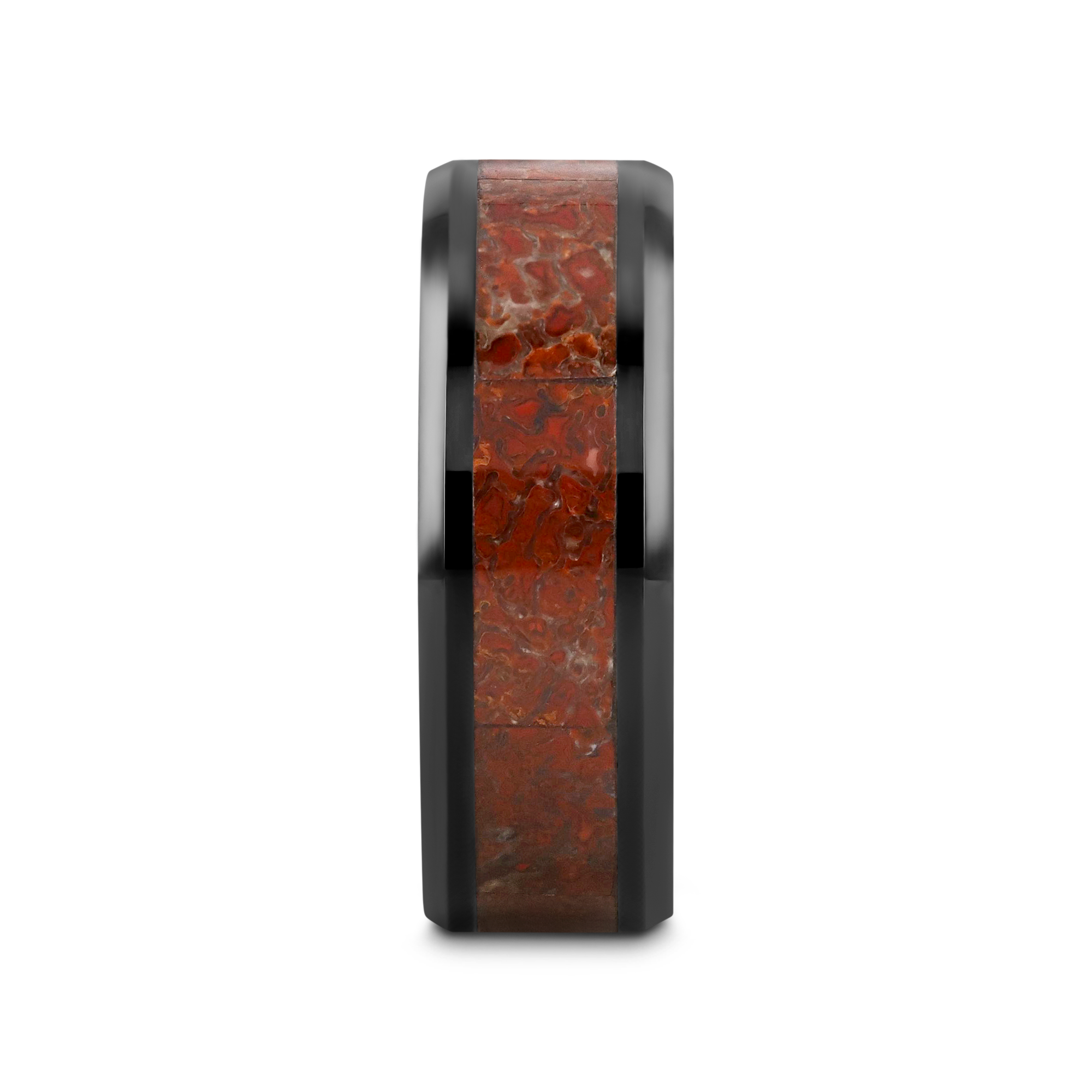 A wedding band 230 million years in the making. Carefully excavated authentic mineralized dinosaur fossil cut and inlaid to a scratch-resistant, ultra-durable Black Ceramic band by Thorsten.