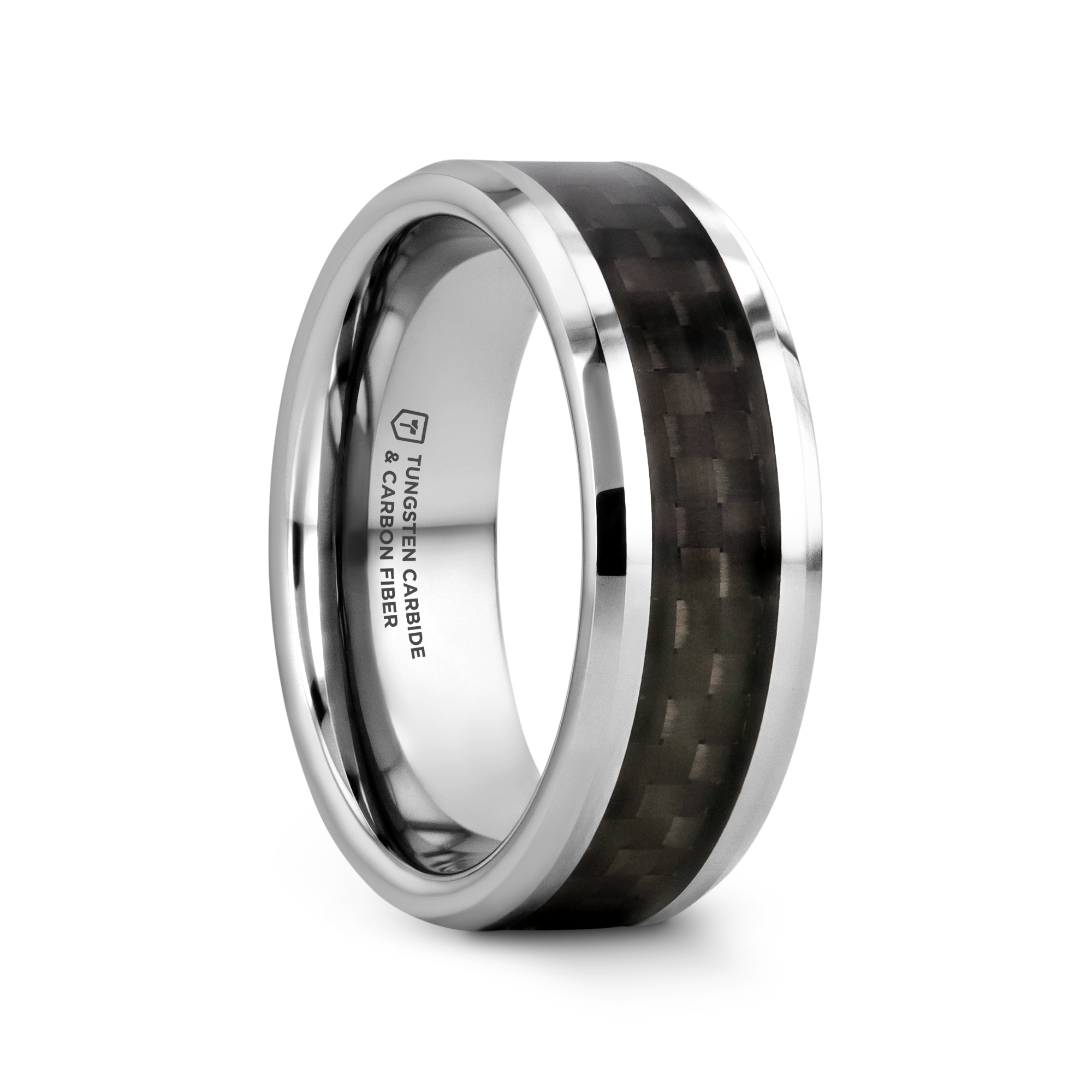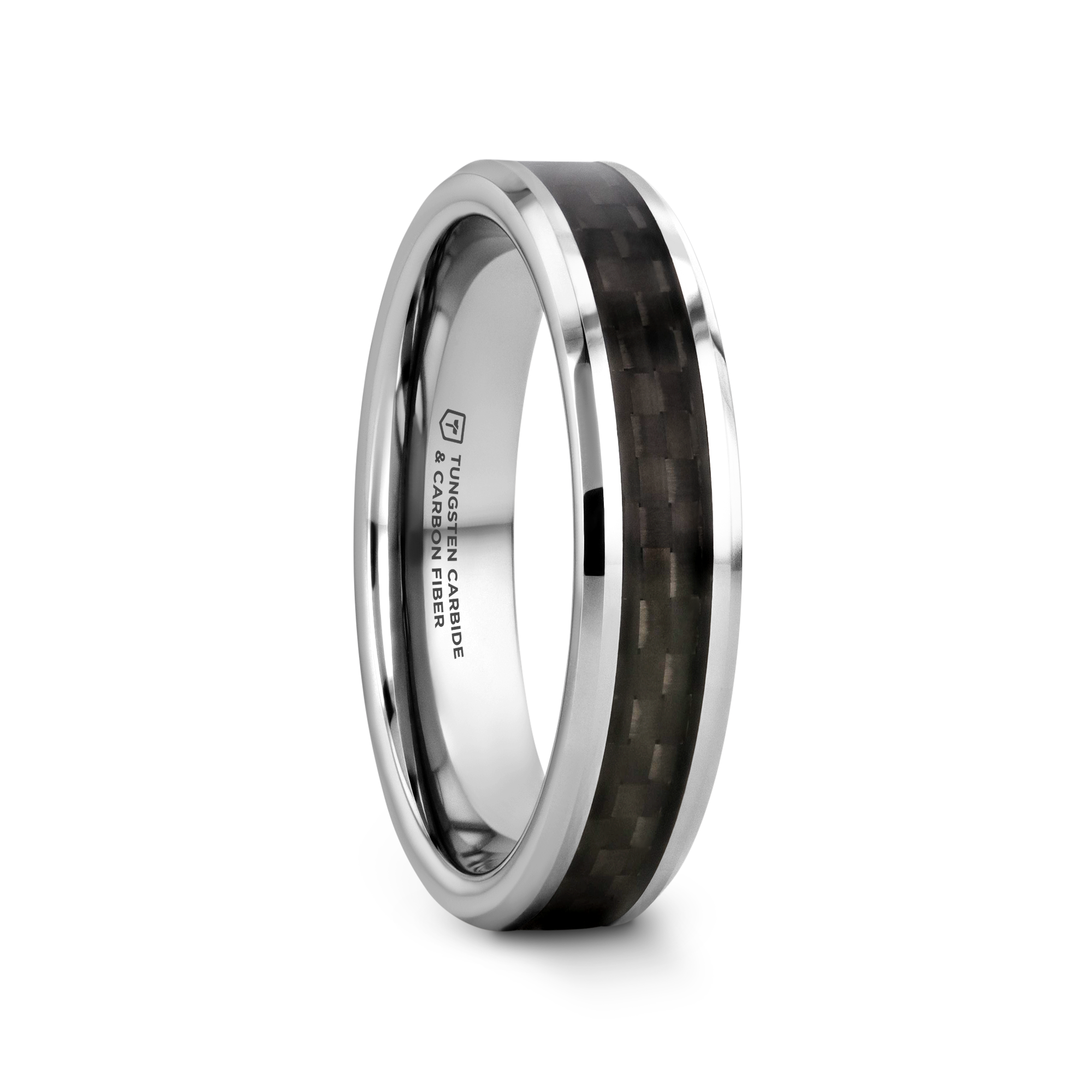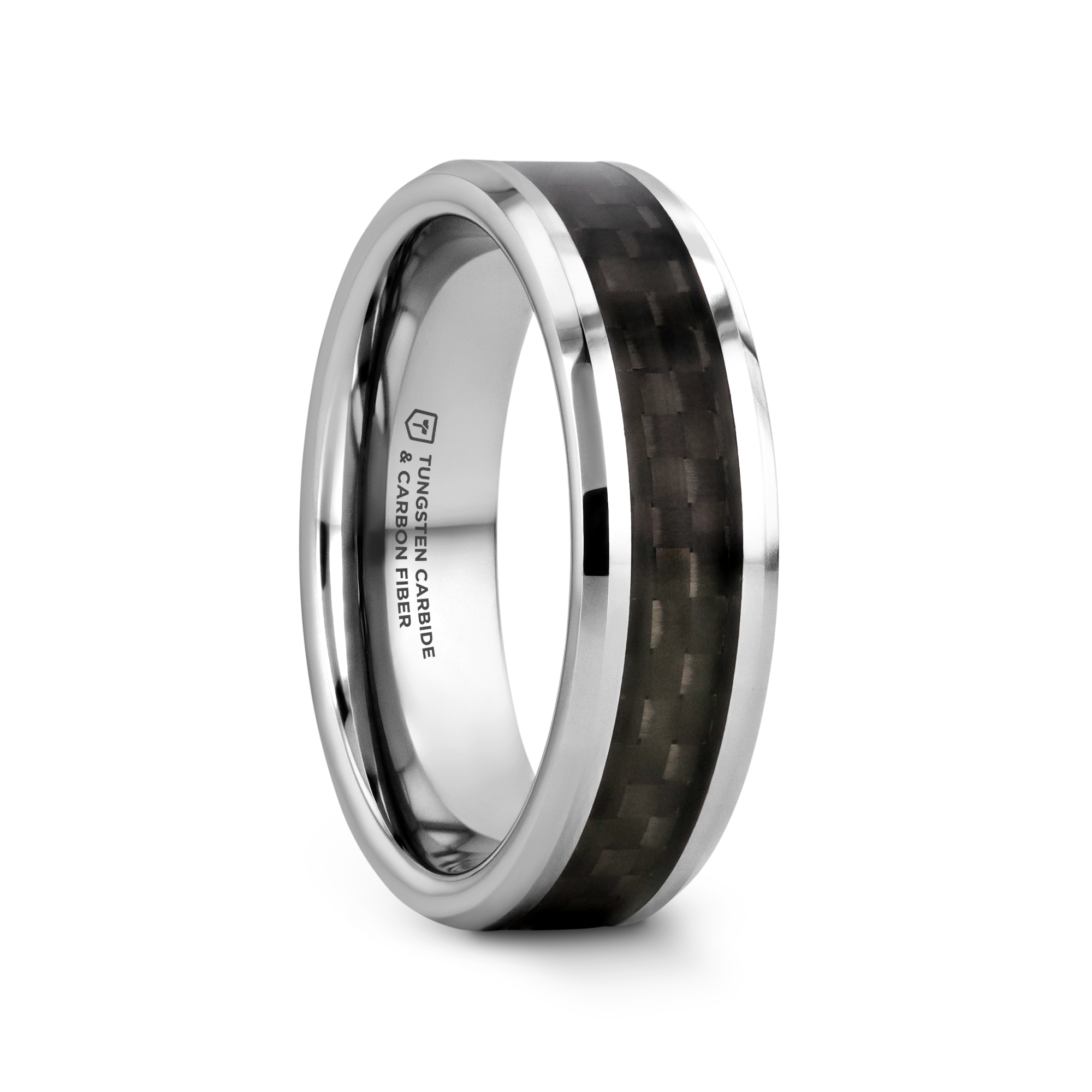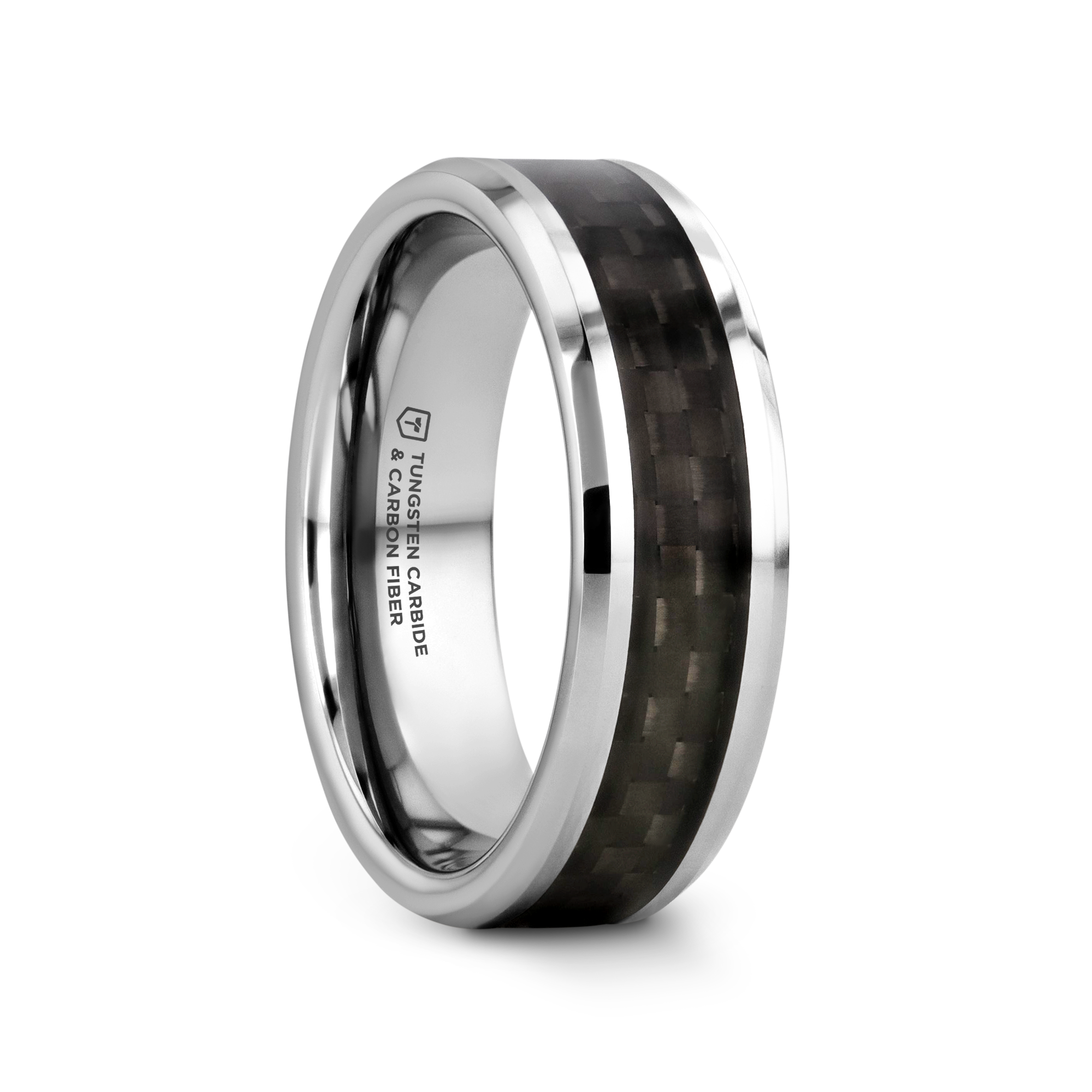 A patterned black carbon fiber is inlaid seamlessly into the center of this beautiful, bevel-edged Tungsten Carbide ring by Thorsten and then an extremely scratch resistant resin is applied over it to protect it from wear.