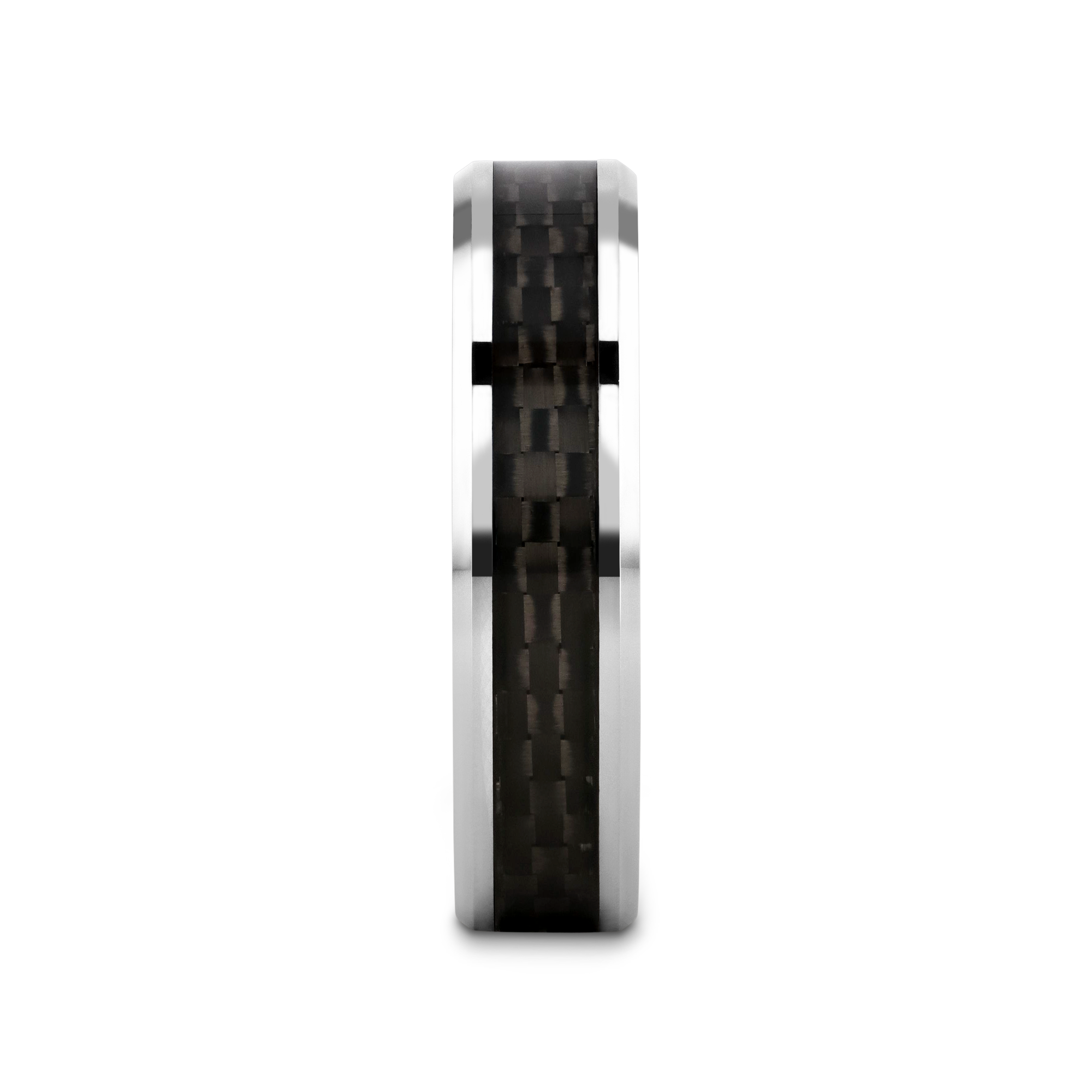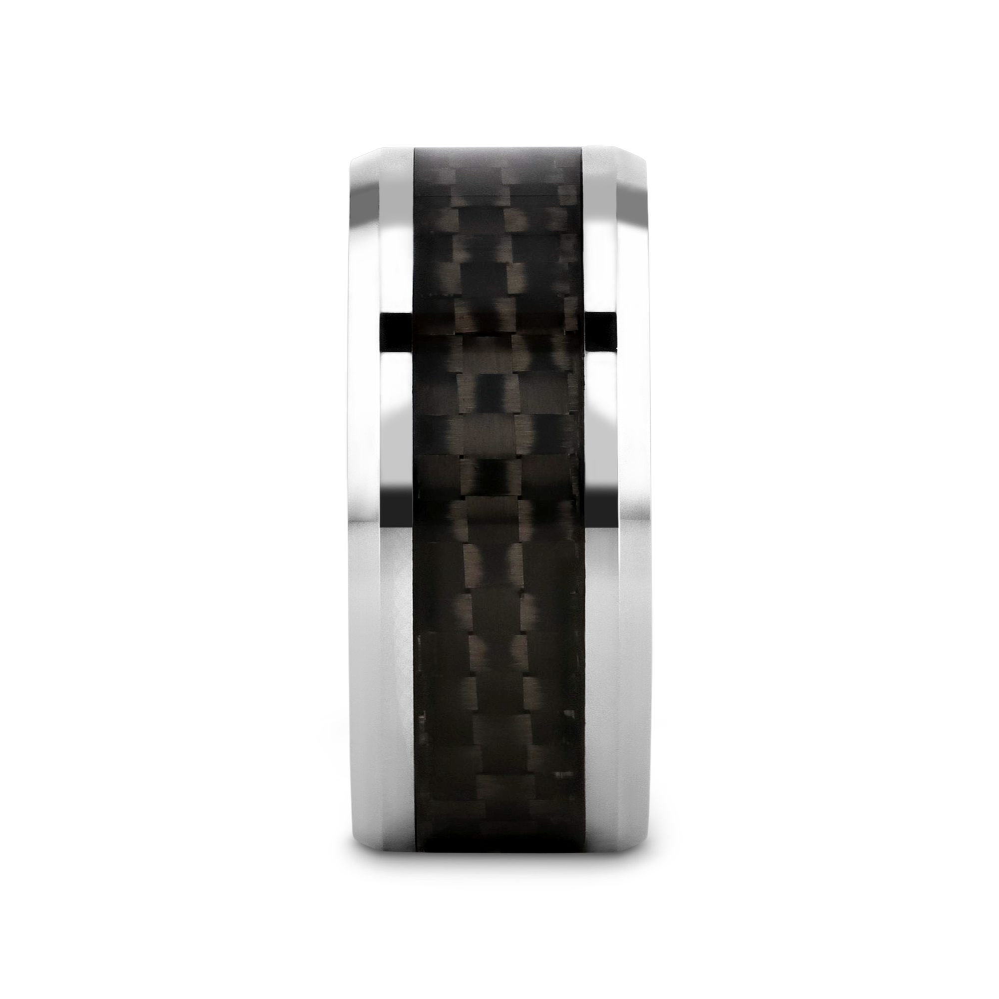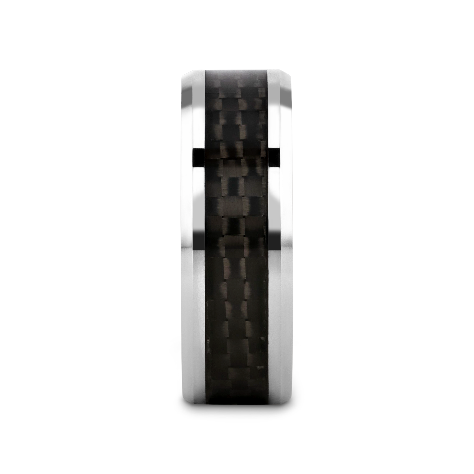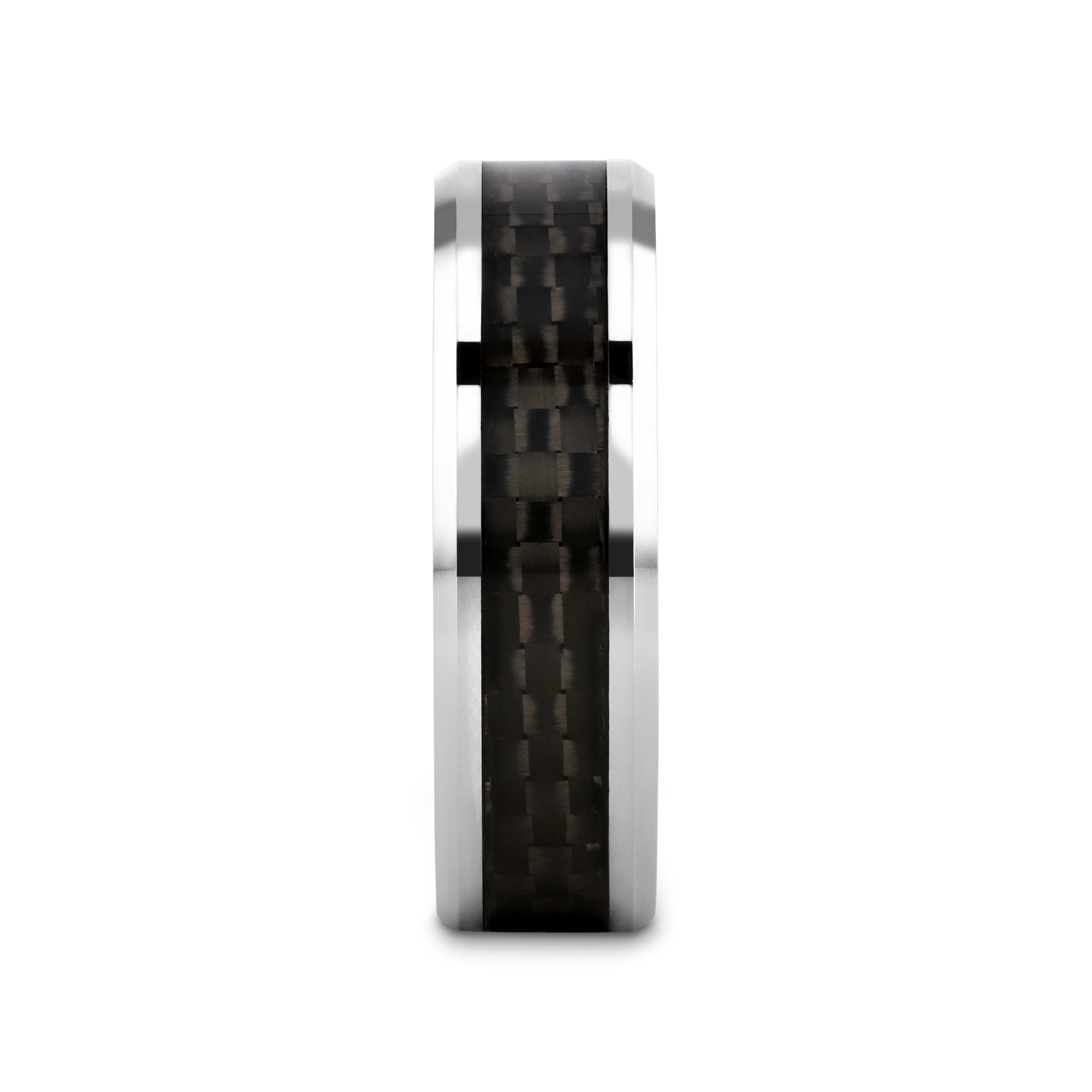 A patterned black carbon fiber is inlaid seamlessly into the center of this beautiful, bevel-edged Tungsten Carbide ring by Thorsten and then an extremely scratch resistant resin is applied over it to protect it from wear.