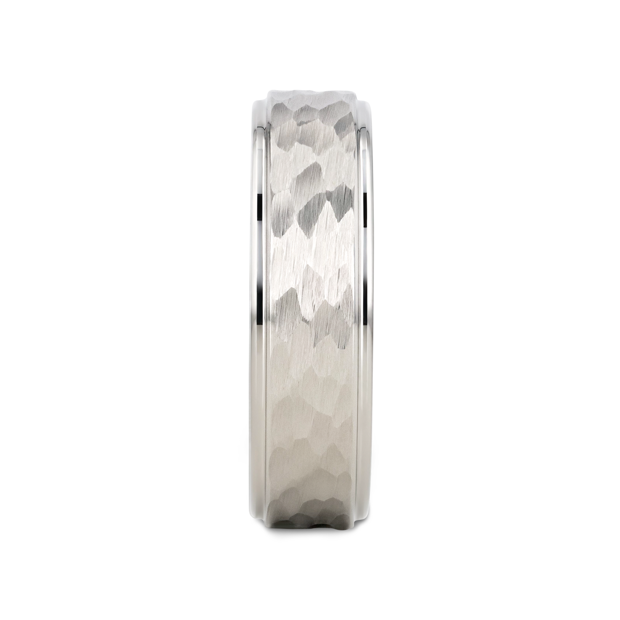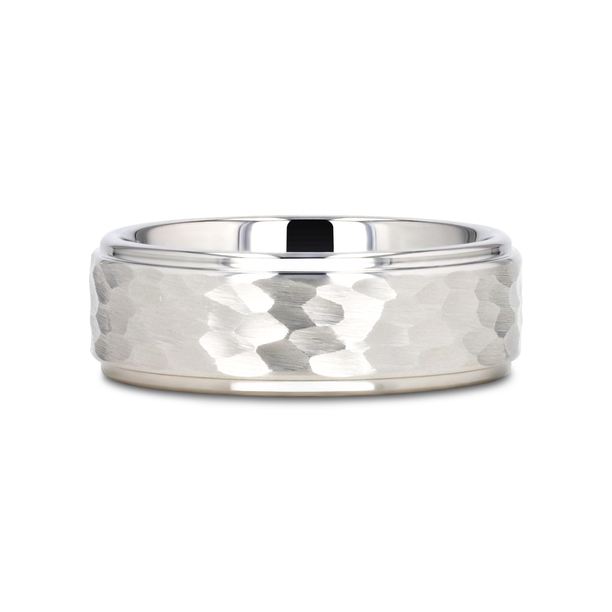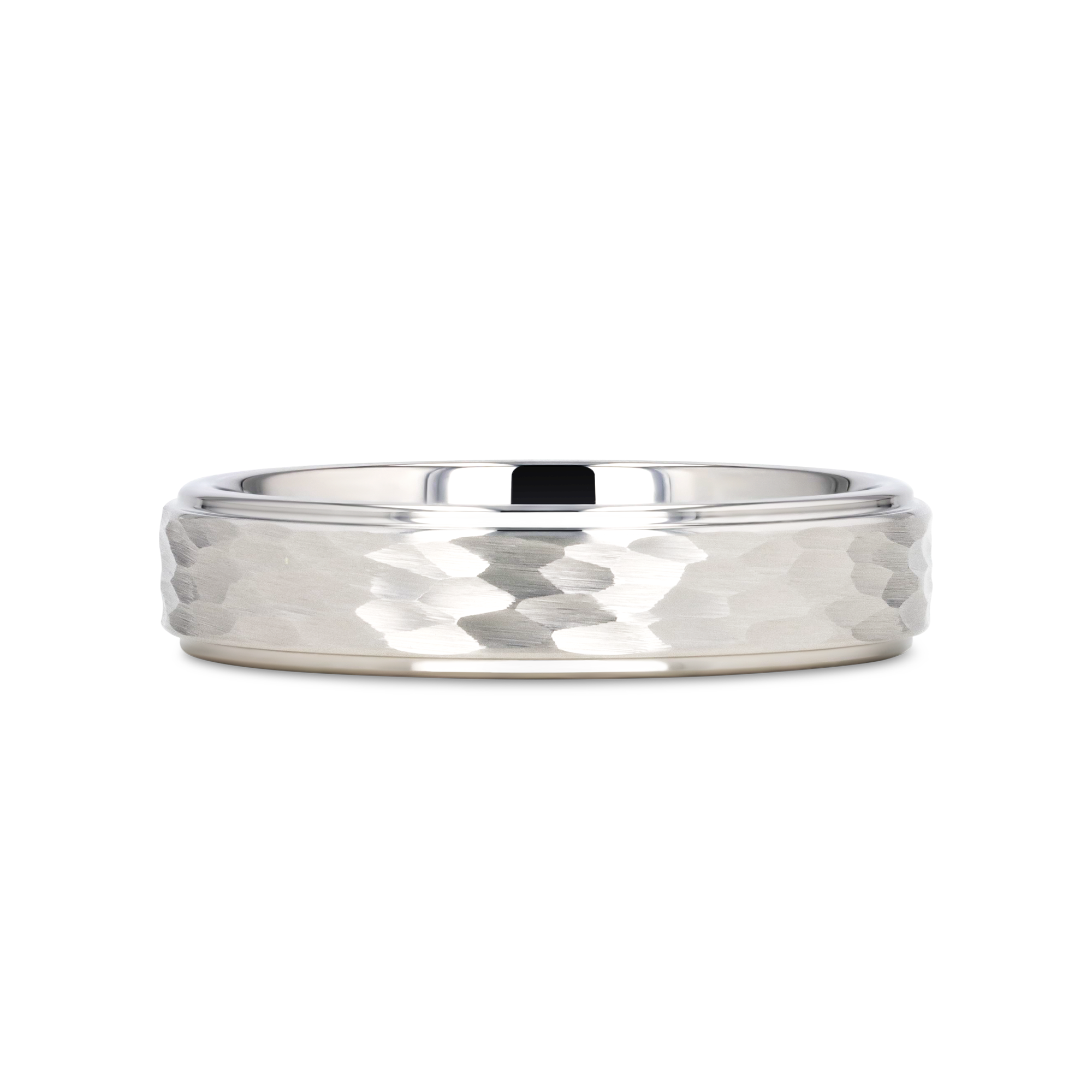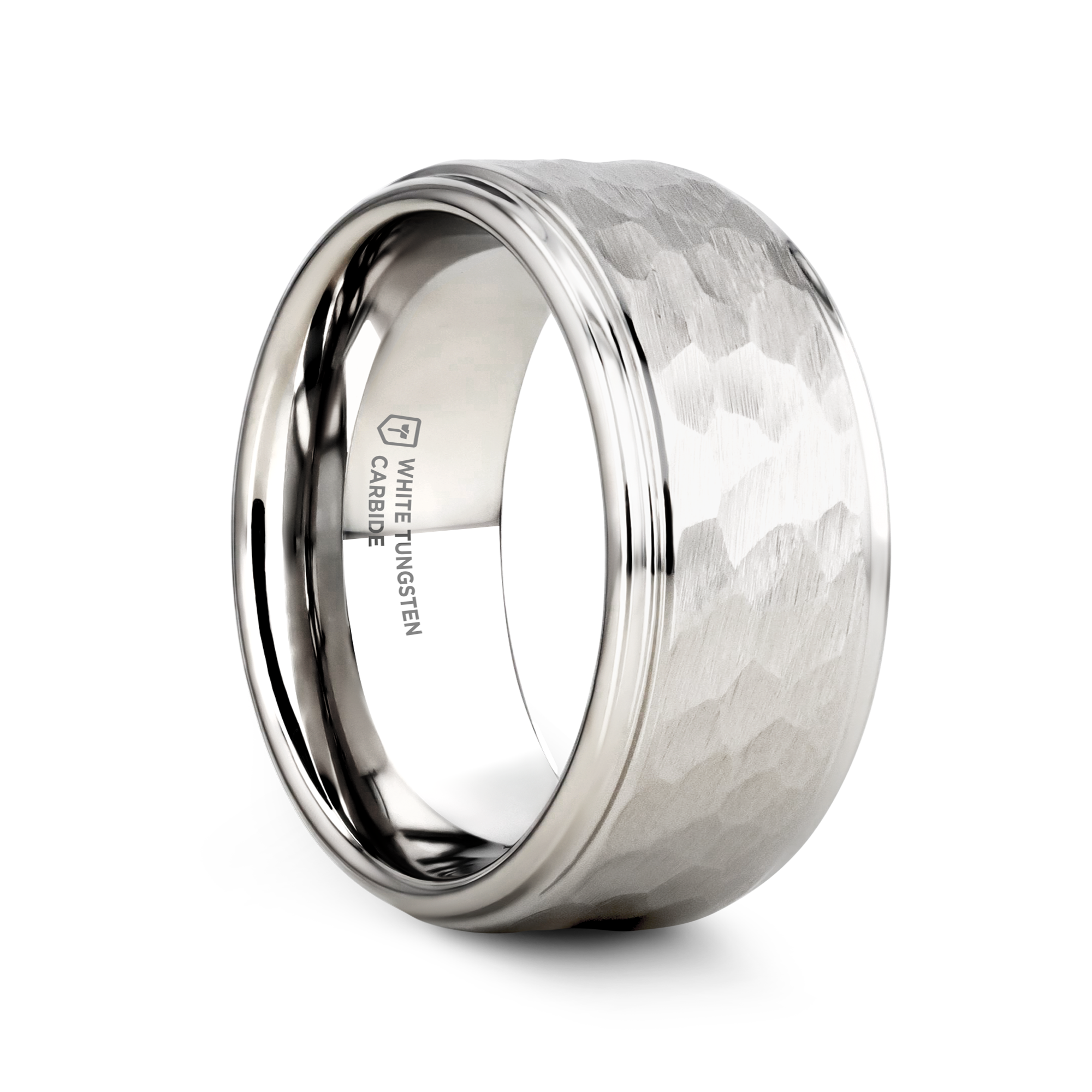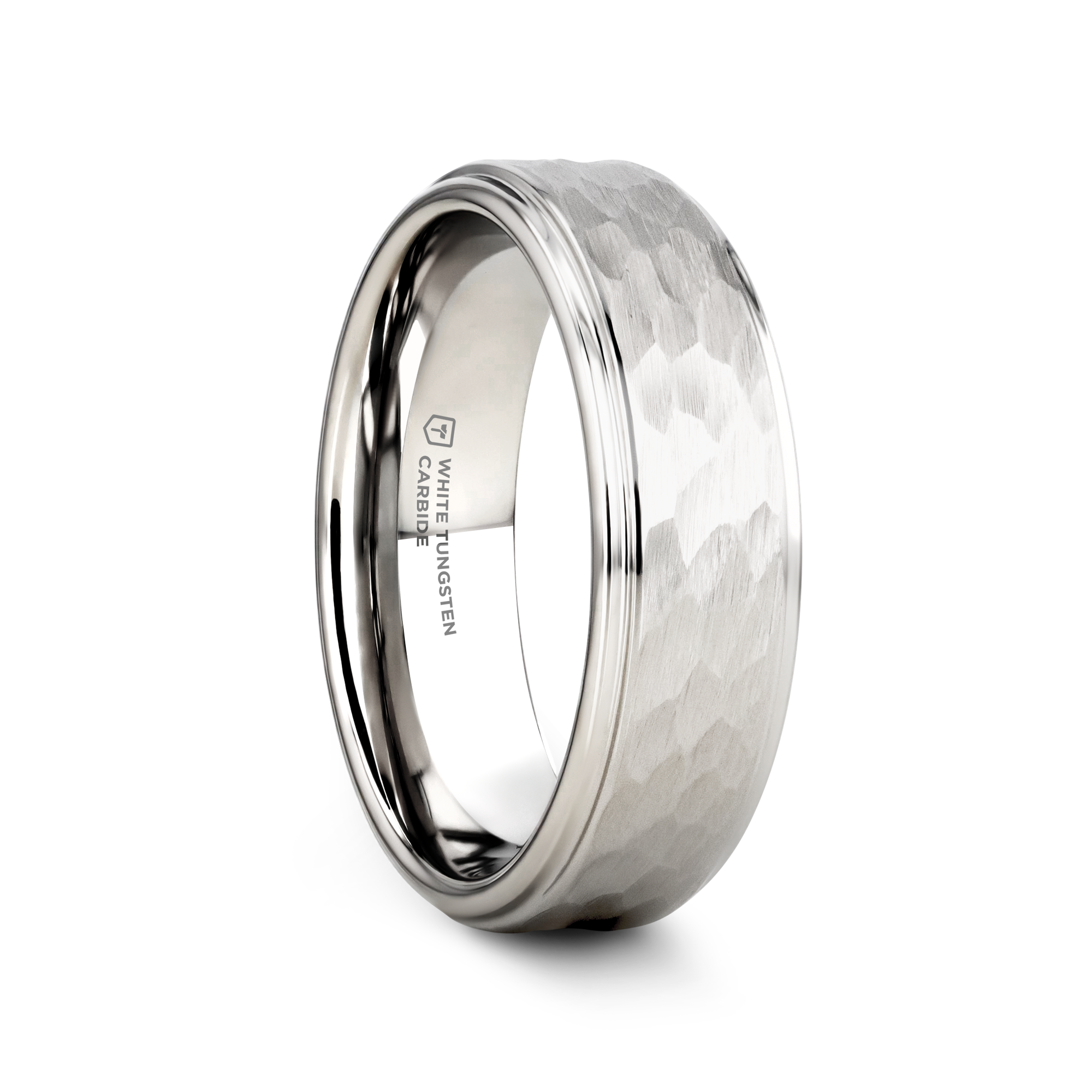 This masculinestyle White Tungsten ring by Thorsten has a raised hammeredfinish center and polished step edges. For couples who want the durability of tungsten with the bright white color of platinum. Our unique bonding process makes the plating more scratchresistant than white gold wedding bands.
