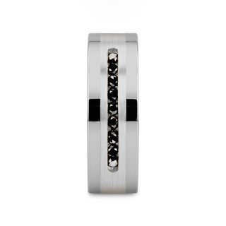 BLACKSTONE Flat Tungsten Wedding Band with Brushed Silver Inlay Center and 9 Channel Set Black Diamonds - 8mm