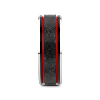 OLIS Wire Finish Centered Black Tungsten Men's Wedding Band With Double Red Stripe Polished Beveled Edges - 8mm