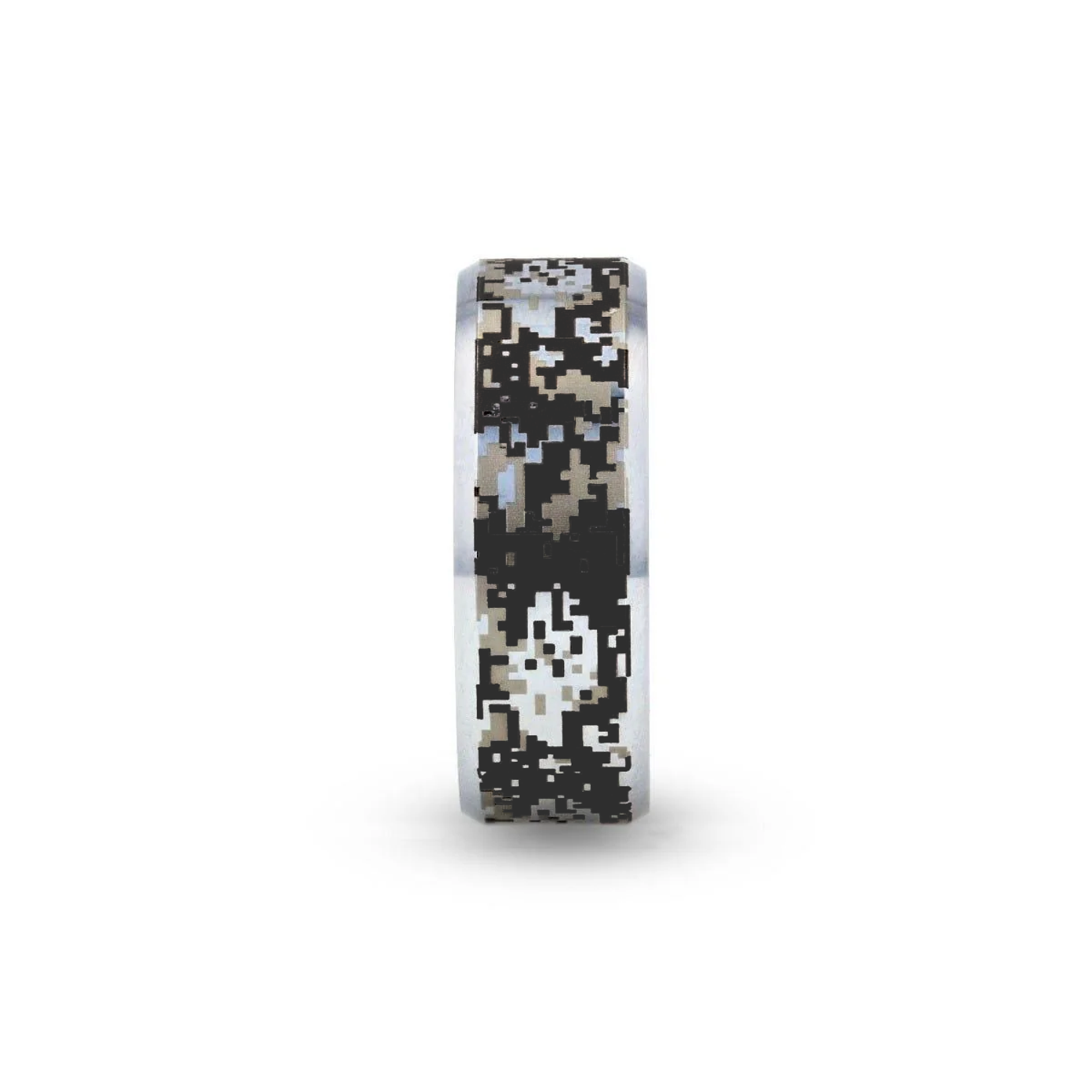 This is a unique digital camo tungsten carbide wedding band from our Camo Rings collection. This wedding band is constructed from tungsten carbide metal which is one of the most scratch resistant metals in the world. The wedding band is designed in a magnificently engraved multi-tone digital camouflage pattern that looks absolutely amazing. The wedding band is also designed with polished beveled edges that really emphasizes the toughness of the engraved digital camouflage.