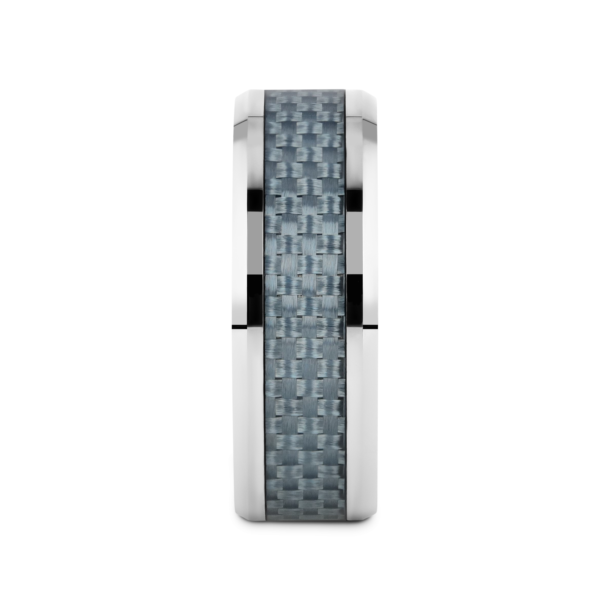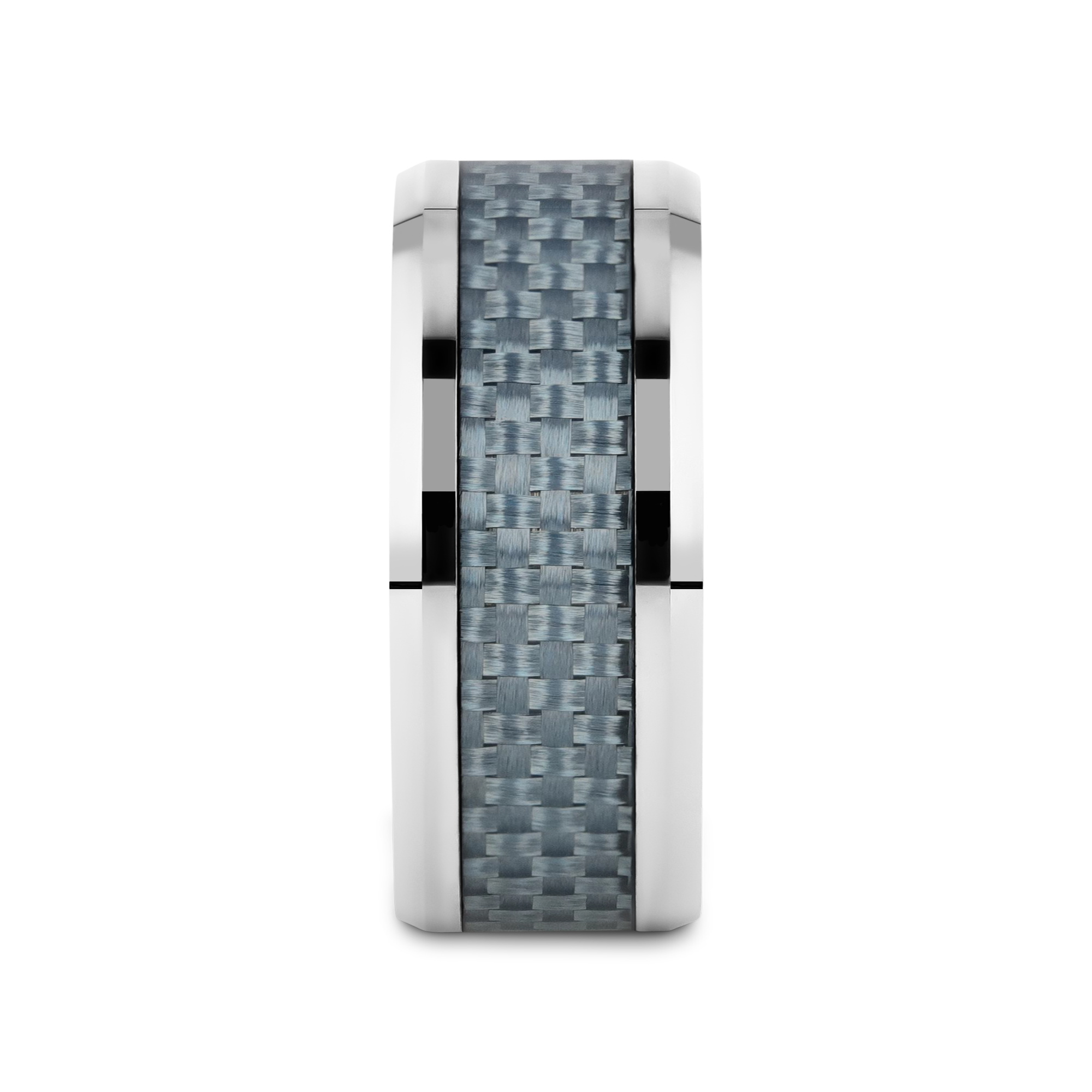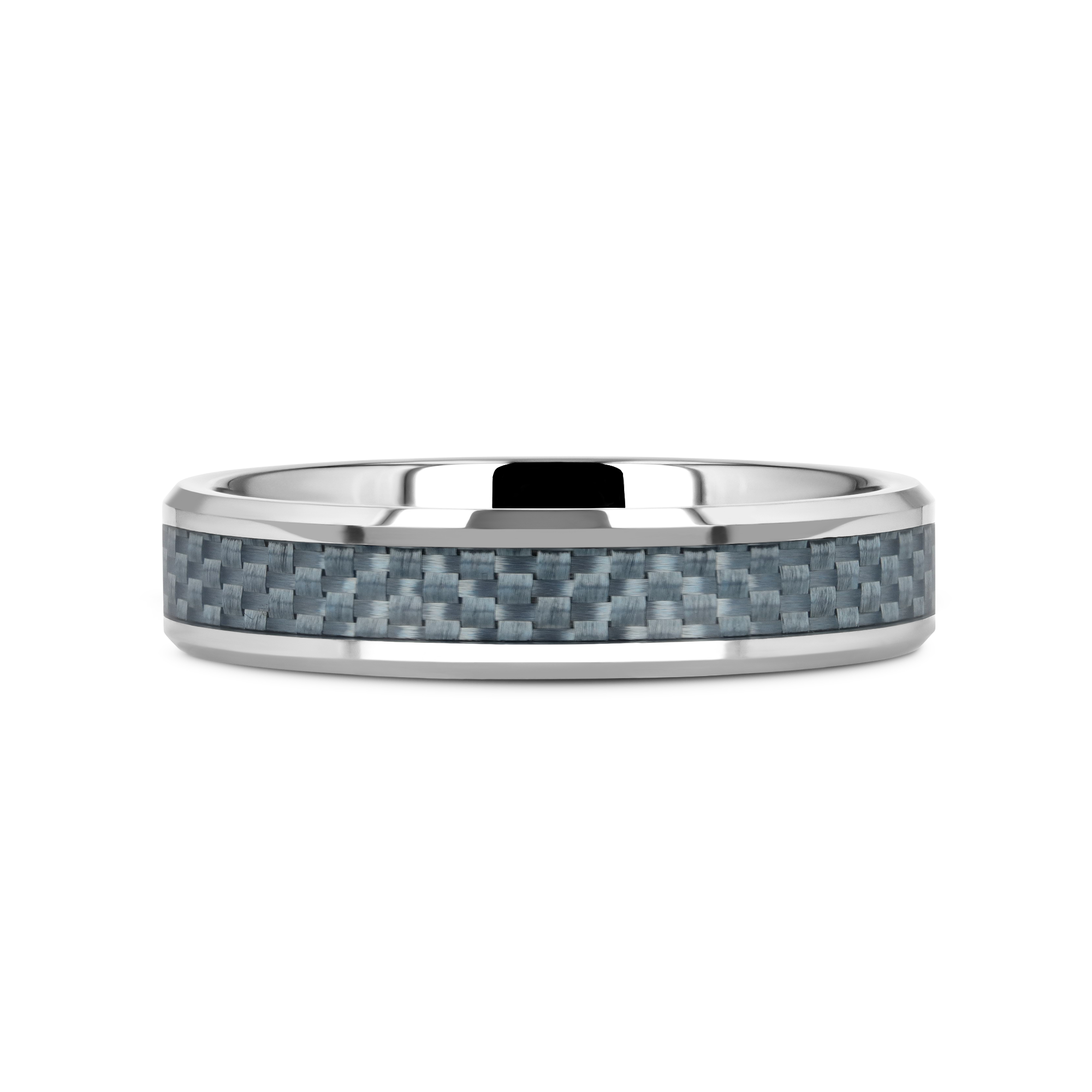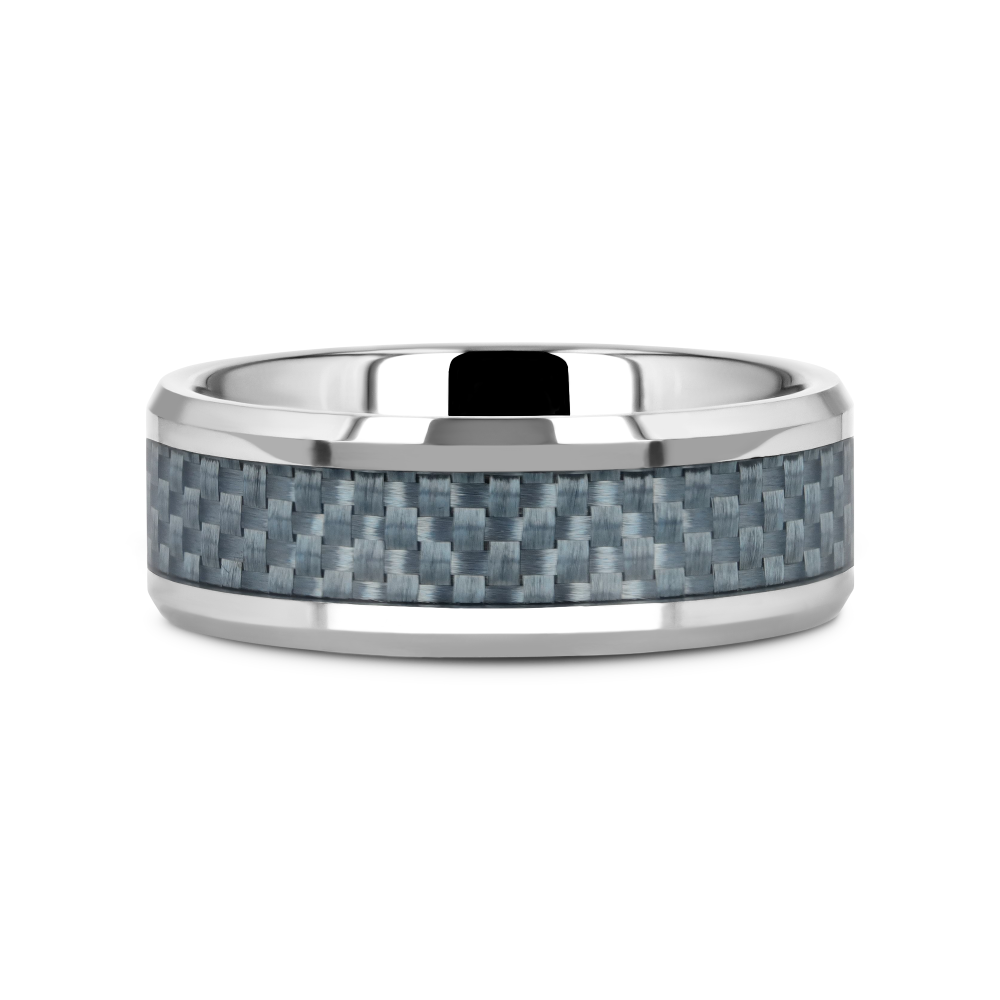 This bold and durable flat-profile Tungsten Carbide wedding band design by Thorsten features polished beveled edges and a premium light blue Carbon Fiber inlay.