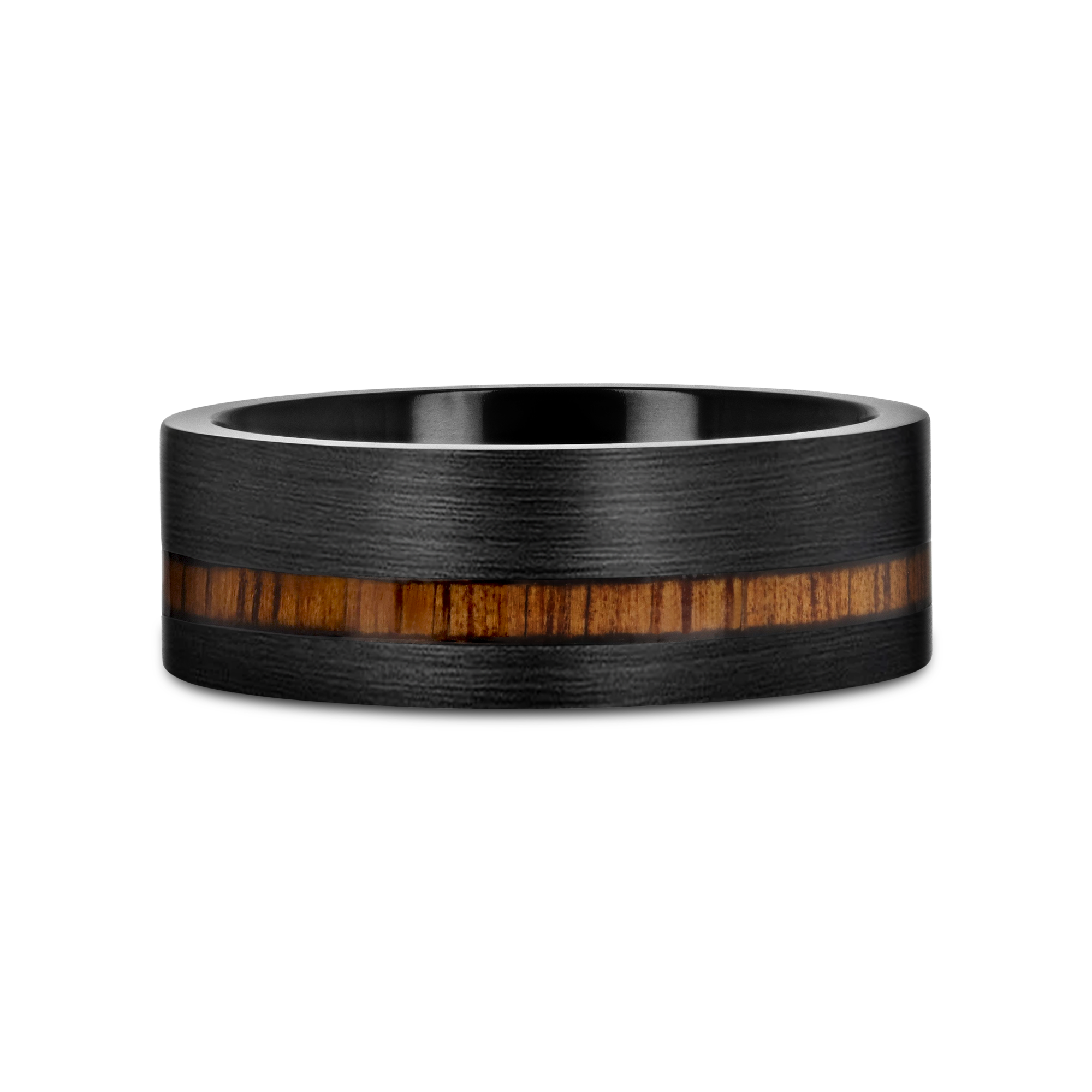 DARING Off-Set Koa Wood Inlaid Black Titanium Men's Wedding Band With Flat Brushed Finish - 8mm